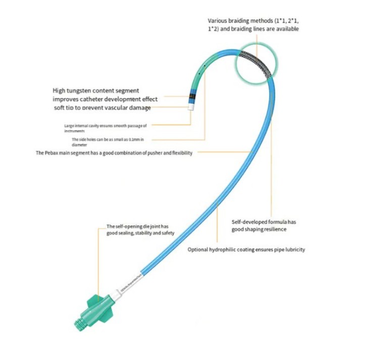 Den flettede struktur spiller en afgørende rolle i kateteret. Det forbedrer ikke kun kateterets mekaniske egenskaber, men forbedrer også dets manøvredygtighed og stabilitet i komplekse vaskulære miljøer. Specifikt danner den flettede struktur en skal med høj støtte og fleksibilitet gennem det forskudte arrangement af flere ledninger, hvilket giver en god anti-knæk- og skubbekraft under fremføringen af kateteret. Dette strukturelle design gør det muligt for kateteret at bevare sin form i blodkarret, mens det tilpasser sig blodkarrets bøjning og vridning og reducerer skader på blodkarvæggen.