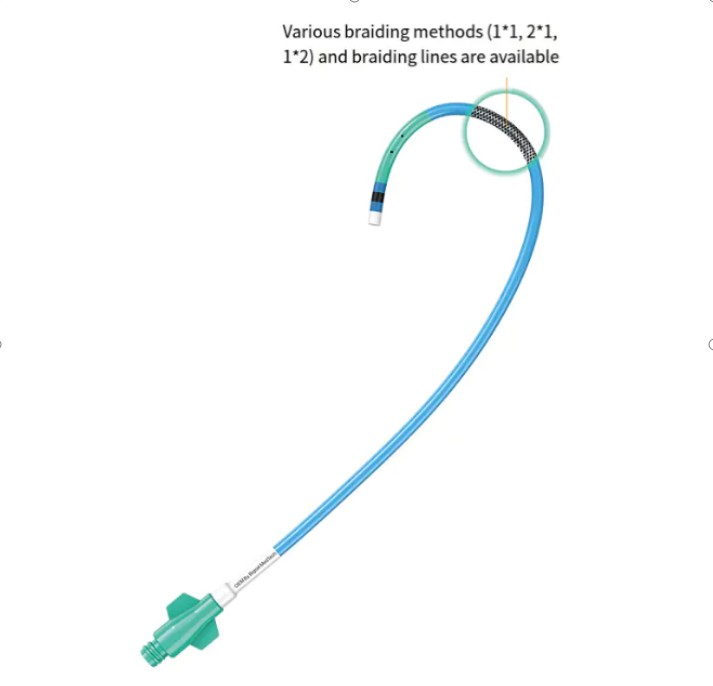 I guidekateteret er den flettede struktur normalt lavet af metaltråd, som har god biokompatibilitet og styrke, og kan sikre kateterets stabilitet og sikkerhed, når det opereres i kroppen. Derudover kan den flettede struktur også opnå en balance mellem fleksibilitet og gennemskubning af forskellige flettemønstre, så kateteret kan bøjes fleksibelt, når det er nødvendigt, og give tilstrækkelig støtte, når det skal skubbes.